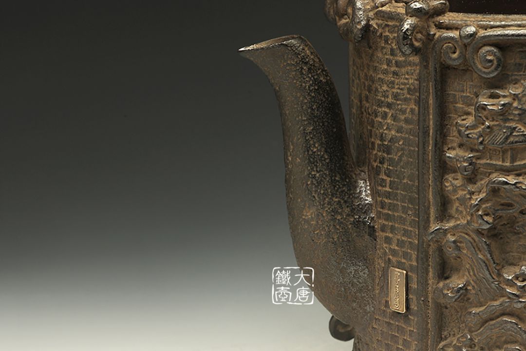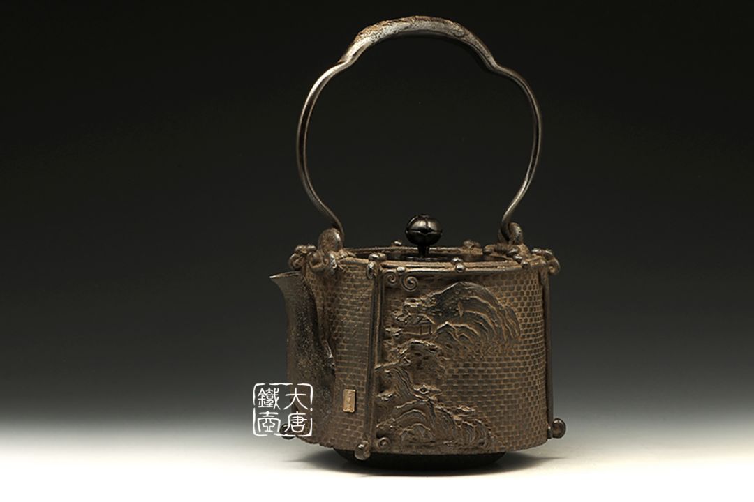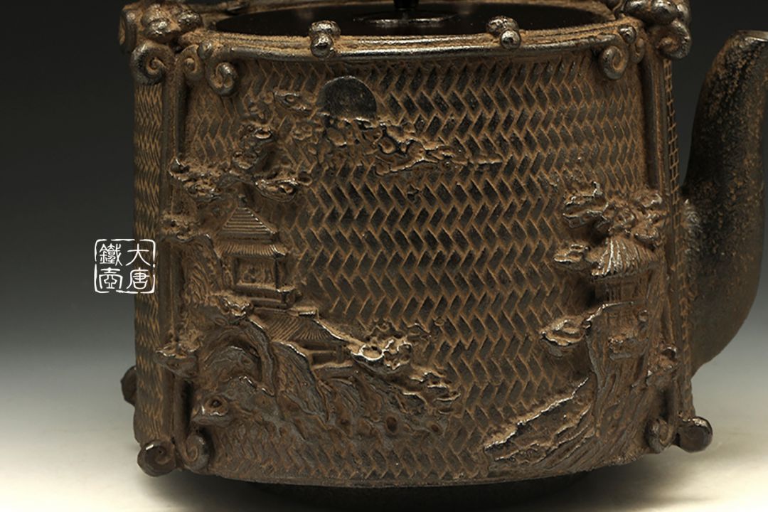 上田照房更是对中国文化几乎达到痴迷的程度,集金工浮雕于一身,造就了大量惟妙的山水楼阁浮雕铁壶。
