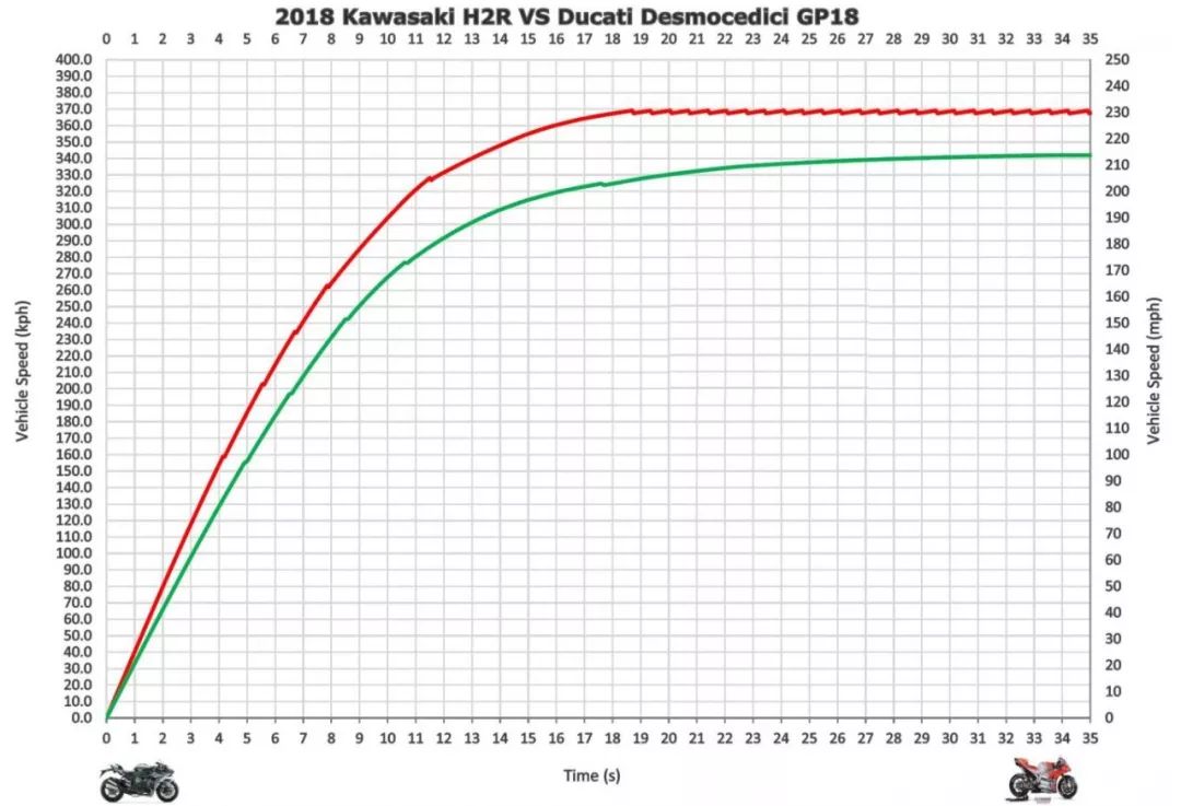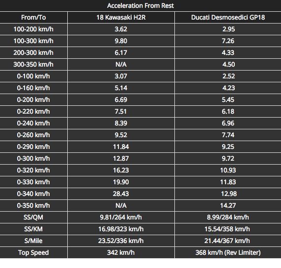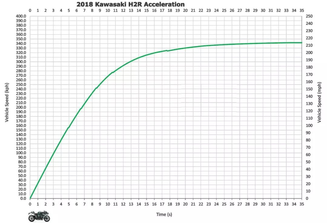 这些数字确实使得H2R能够打败常规的1000cc运动摩托车,特别是速度为200至300km/h区段加速,要迅捷得多。