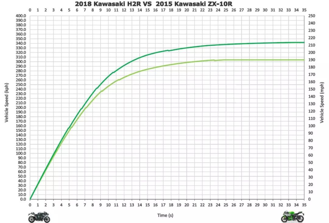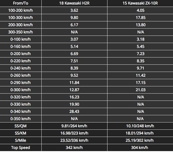 从100-300km/h,以及200-300km/h的速度来看,H2R的性能优于ZX-10R,且远远超过了起步加速时的差距。