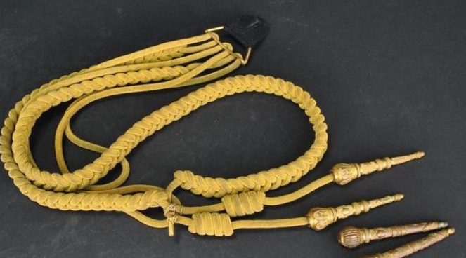 将官的饰绪是由三股三进的金丝线编织而成的,这种配饰只有在穿着礼服的时候那可以佩戴,平时的时候是不可以佩戴的,将官配饰除了非常重要的活动,在平时是很难看到的,而参谋配饰是由六股六进的金丝编制的。它和将官的饰绪区别还有就是颜色上,参谋饰绪要比将官饰绪的颜色浅一些,而且这种饰绪可以不论礼服还是常服,都可以佩戴,所以,在一些报纸或者照片上,我们经常能看到的多数也都是参谋饰绪。