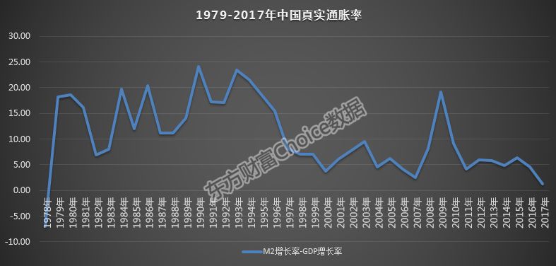 在这里,我们利用货币供应量增长率-GDP增长率来简单计算真实通胀的情况,这其实正是国际上通用的“GDP平减指数”计算方法的另一种表现形式。