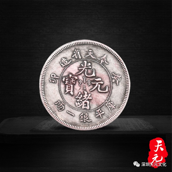 近日,深圳市天元文化有幸徵集到了一枚大清光绪元宝奉天省造库平银一两。如上图所示,此枚钱币正面中央珠圈内撰写汉文“光绪元宝”,珠圈外上篆汉文“奉天省造”,下篆文“库平银一两”,左右有纪年“癸卯”;背面中央为蟠龙图,上环篆英文省名“奉天省”,下环撰英文币制,左右各有一朵六花星。