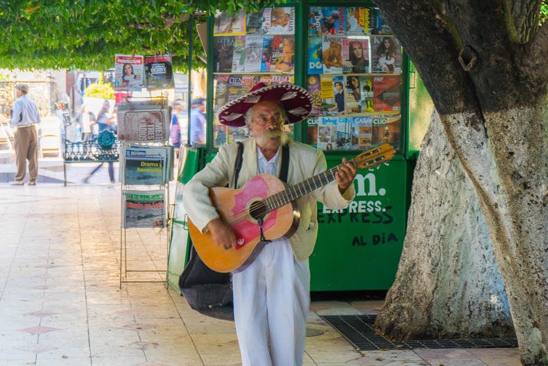 华雷兹剧院旁边就是联合花园,是小城最最热闹的人群聚集地了。我昨晚就是在这儿听着音乐看着人流享受晚餐。在这儿随处可见的墨西哥风格的弹唱歌手,就如寻梦环游记电影中那样,戴着墨西哥宽边草帽,穿着小西服,背着自己熟悉的手工吉他,自顾自的唱着歌。