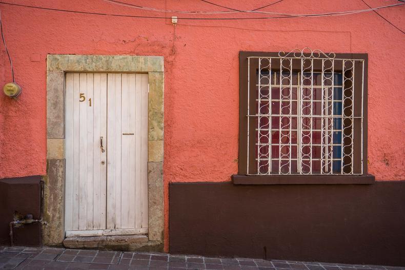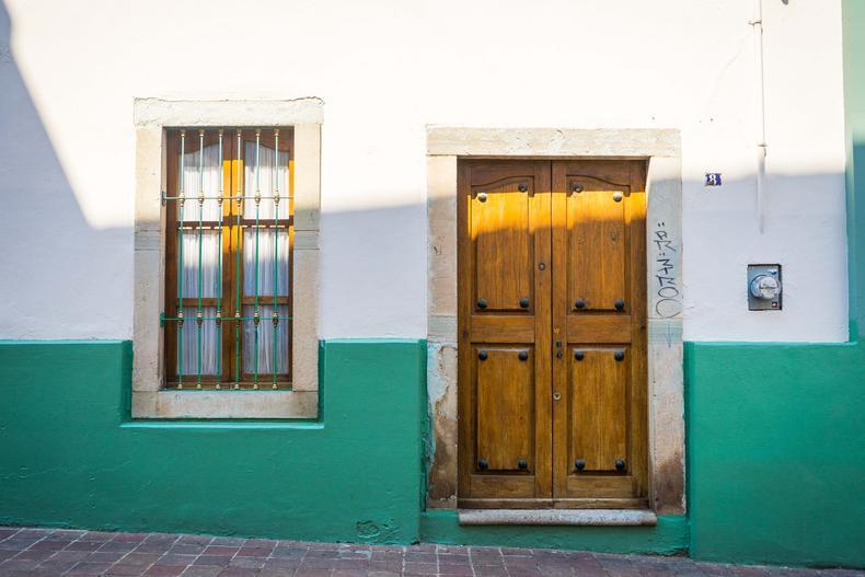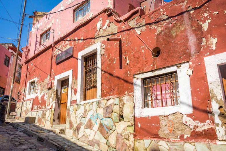 按照地图,沿着主街道,瓜纳华托的道路,每一条都是一块砖一块砖堆砌起来的,完全没有一条是水泥路,所以每走一步踩在砖块上,脚上都很有感觉,越走越像是回到旧时代,街道两旁也都是风情的老式建筑更给你一种错觉了。 街道两边有些酒店,有些餐厅,有些酒吧,而当地居民的住处也混杂在其中一时难以辨认。每栋楼的颜色都颜色分明,有些鲜艳有些朴素有些复古,而且反倒是越破旧的越是让人喜爱。