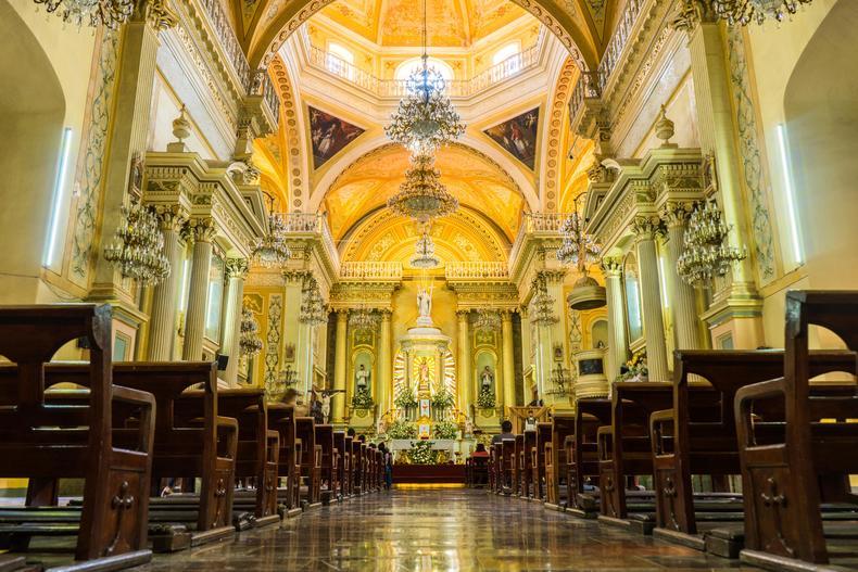 下面这座,就是瓜纳华托圣母大教堂,小城中尤为显眼的一栋建筑。要说显眼可能归功于这明亮的颜色吧,粉饰的橙黄色的高墙搭配红色的圆顶,比起北美一些灰色砖墙的圣母大教堂就高调了许多。教堂本身的建筑构造也不显得单调,围绕着教堂走上一圈,每个角度都自成一景。 走进去参观,内部就不想建筑本身那么高调,倒显得很是肃穆。