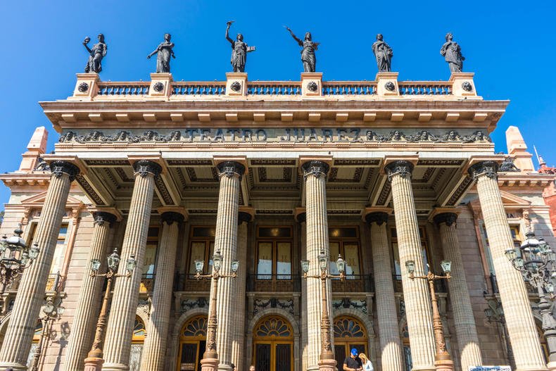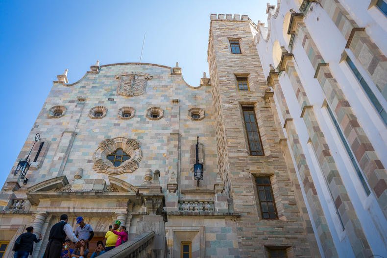 沿着昨晚走过的路,一切熟悉又喜爱。去往大教堂和瓜纳华托大学,会先经过华雷兹剧院,这是墨西哥最美的剧院之一,剧院至今已有130多年历史,它的门廊为罗马式建筑,信道是一系列的宽步阶梯,两旁有古铜狮子对峙,屋顶上有6个天使雕像护卫着。有兴趣的话,还是可以花35块的门票费进入参观,我可能对于闲逛小城的爱胜过了这个建筑本身,所以并没有进去。