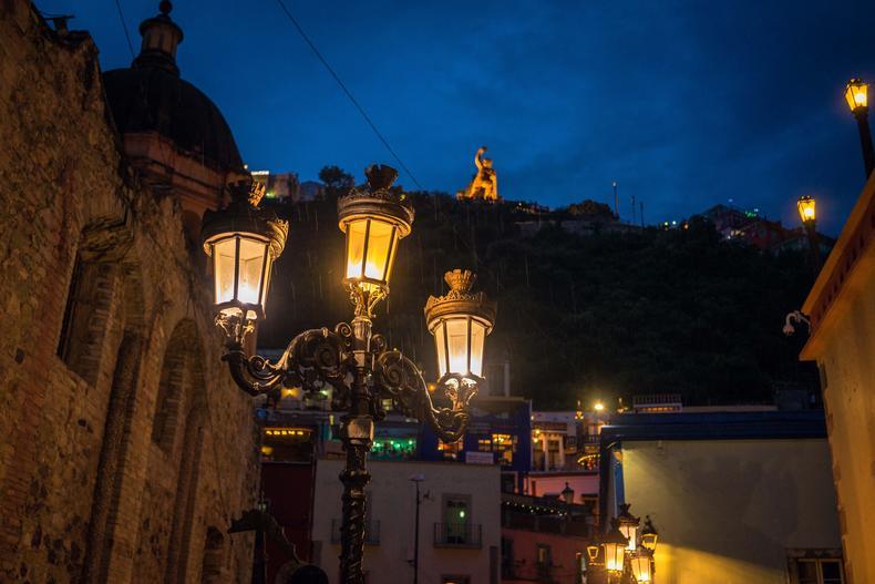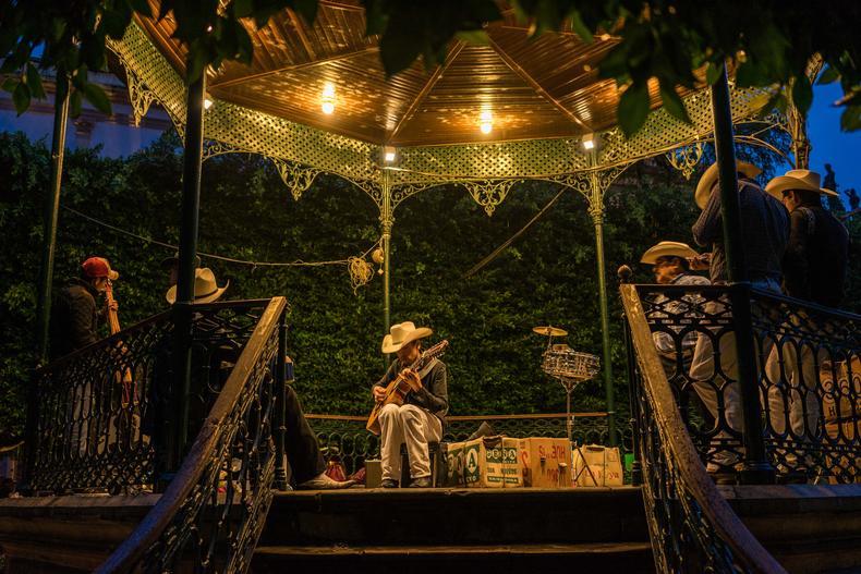 天色黑了下来,小城却灯火通明,雨也就零星的在滴答,所以街上又开始涌动起人潮,音乐声此起彼伏,还有各个酒吧的服务员在小街上开始揽客。我原本真的会以为这是一座安静的不会被人打扰的山中小城,我错了,这儿可是墨西哥,是音乐活在灵魂里的墨西哥啊! 我看到一个跟寻梦环游记里一个很像的小亭子,里面就有音乐人在表演。所以我再看电影的时候,感觉尤为的亲切和喜爱!