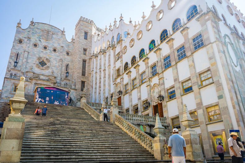从瓜纳华托圣母大教堂穿过一个街巷,就走到了瓜纳华托大学。这座大学同样也是尤为显眼的建筑,与教堂不同的是这座建筑确实简单素雅的白色,与教堂颜色的橙红交相呼应,造就了这一靓丽的景致。 这座大学建于20世纪50年代,这个先锋的设计因为和历史悠久的小城风格不符而在当时饱受争议。我想别说当时,就是现在的一些学校建筑也很少有这样风格,尤其这个超大的阶梯令人印象深刻,运气好还可以在这儿看到演出。 都说学校是可以免费参观的,可是我当时不知道是进错了门还是特殊时期,准备进去了又被赶了出来,有些可惜。