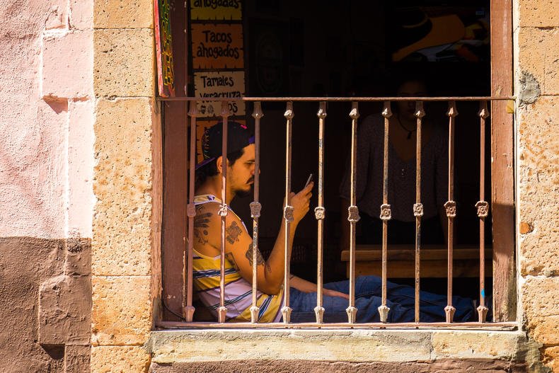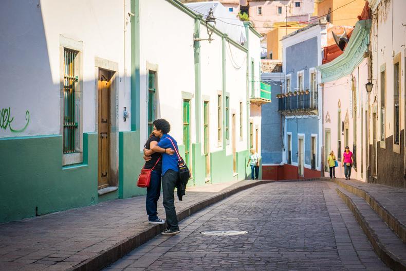 瓜纳华托的构造与氛围,造就了这座城市特有的情调,那就是爱。无论走到哪儿你都能看见恩爱的一对恋人,夫妻或是家人,他们都会挂着幸福甜蜜的笑,或在交谈或在牵手,是一座名副其实的爱之城吧。 所以,这个城市有个特别的景点叫“接吻巷”。为什么叫接吻巷,因为阳台几乎靠在一起,隔着阳台俩人就能热烈拥抱亲吻,“接吻巷”因此得名。巷子最窄处只有五六十公分,这儿流传着一个如同罗密欧与朱丽叶的凄惨爱情故事。 可能是上天欺负我这个单身狗,我并没有找到这个地方。也好,省的看别人秀恩爱!可是大马路上,遍地的都是秀恩爱啊!!!