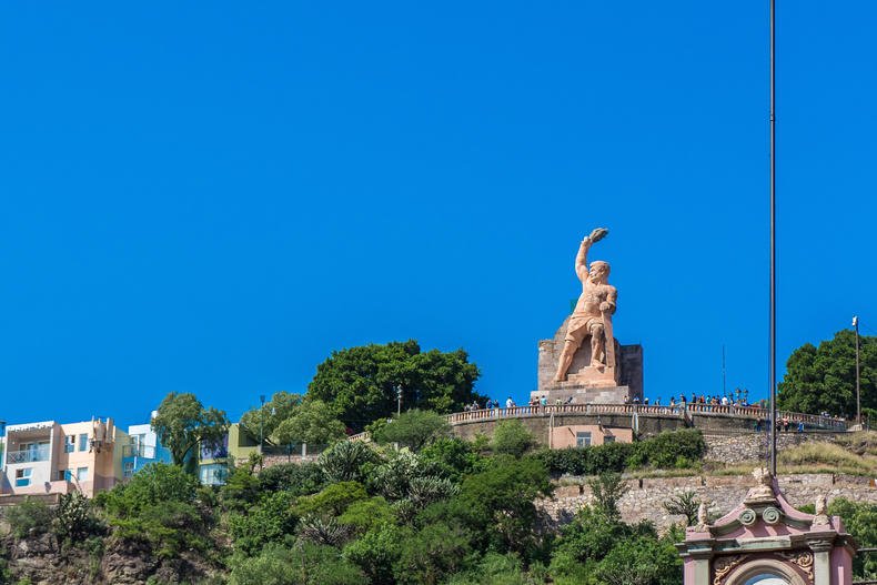 渐渐的走近了教堂附近,视野也变得开阔,好像是又到了一个广场附近,所以周围都比较空旷,没有在小城街巷里走着时候的拥挤。 往山上远眺是可以看见瓜纳华托小城的重要标志景点皮毕拉纪念碑。要说这个雕塑本身可能没什么特别,但是他在的位置是饱览瓜纳华托小城全景的绝佳制高点!几乎所有的游客必然会去那里拍照。 至于怎么上去,你要是脚力可以就慢慢的走上去啊,而且我很建议。虽然路途有点绕有点远,不过刚好可以漫步在小城街巷里,每步一景,也能遇见不同的人,会是一个很好的享受。另一个方式就是乘坐缆车可以直达观景台,绿色的小车厢会便利许多。
