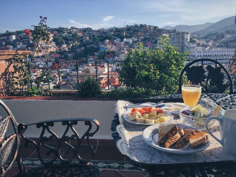 在瓜纳华托我预定的是一家坐落在半山腰的客栈,名字叫——迪奥尼西奥之家酒店,评分8.8的人气酒店哦!这么高的评分,归功于独有的露天天台了吧!在天台上可以鸟瞰瓜纳华托小城的全景哦!每天早上我都让店员把早餐直接送到天台上,边看风景边吃早餐!