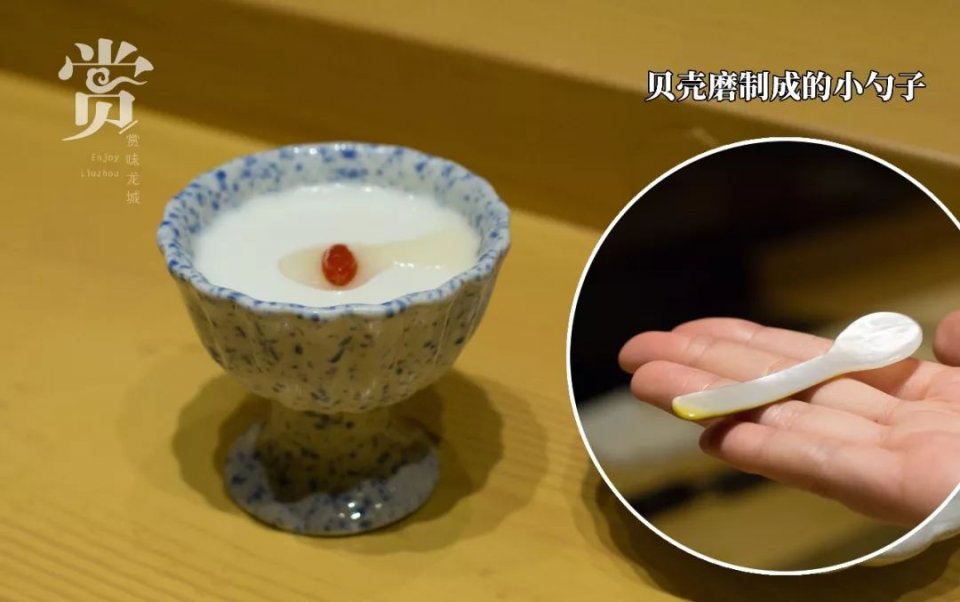 最后再以细嫩清甜的杏仁豆腐收尾,服务员贴心的送上贝壳磨制成的小勺子,让豆腐的口感更为冰爽清甜,让人直呼舒坦~