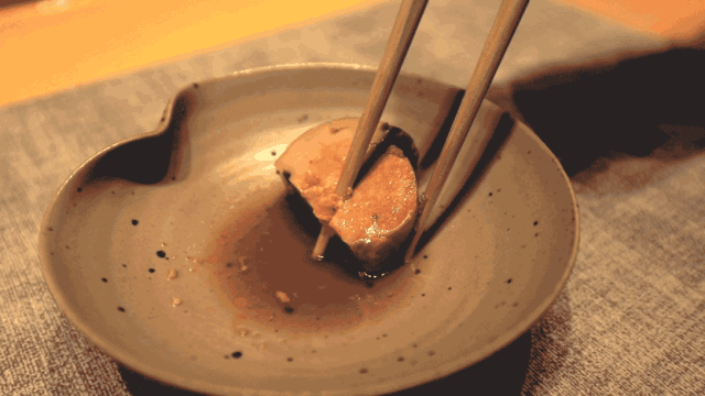 采用最简单的手法进行操作,不同在于对原材料的选择。鹅肝寿司作为最后一道的寿司出场,咬上一口,“汁水一下就爆开”,出乎意料的柔软细腻,和米饭交融在一起,满足了所有人对寿司压轴期望。
