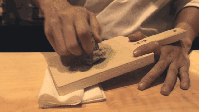 不同以往的寿司店,花隐士omakase的わさび(芥末),需要用鲨鱼皮制作成的模板现磨,将新鲜的山葵根磨成绿色的芥末泥,手工现磨wasabi与普通的芥末相比不呛、不辣。