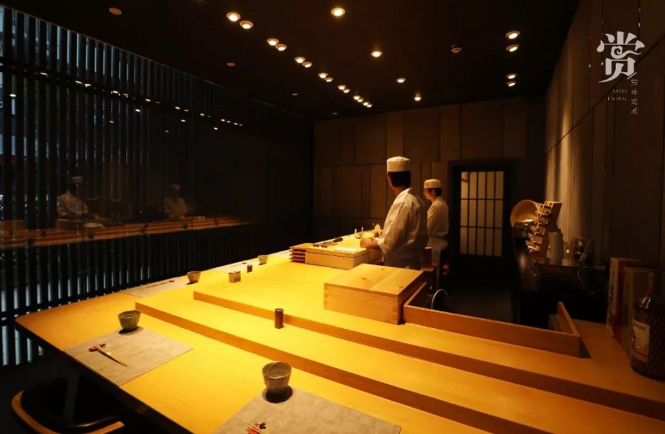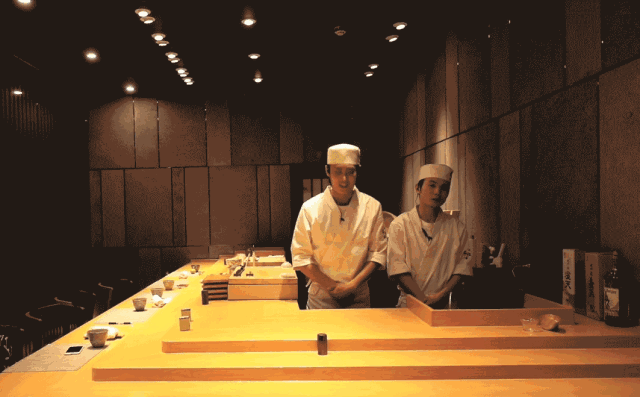 不同以往的omakase,这儿的“板“设置为“舞台式”的设计,可以让料理的全程的一举一动,一览无余,没有可以“遮丑”的地方。由暗至亮的灯光顺着阶梯,将焦点聚集在主料理长,一是表示对主料理长的尊敬,二是希望食客在较幽暗的灯光下,进餐不受拘束,更为放松自在。