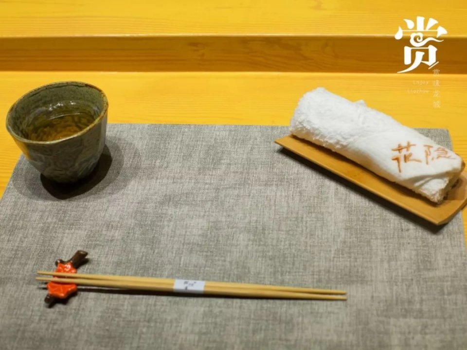 当主料理长每做好一道菜,服务员会根据菜品准备好不同的餐具,每道餐具都十分讲究,都是老板在日本、国内精心挑选而来。两头都为尖的筷子,有着与神共食的寓意。