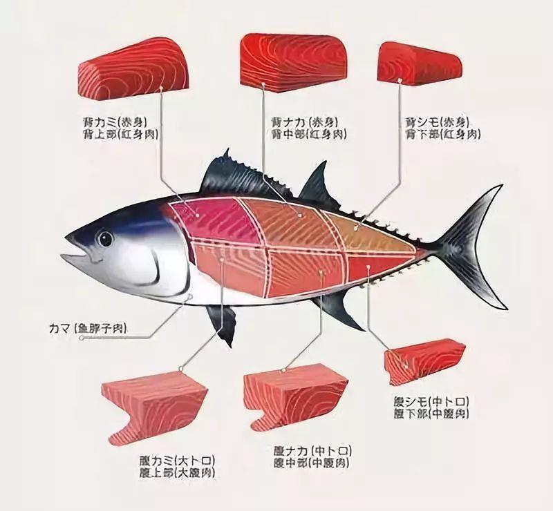 色泽由浅至深,依次为大腩、中腩、赤身。不同部位都有不同程度的鲜美。