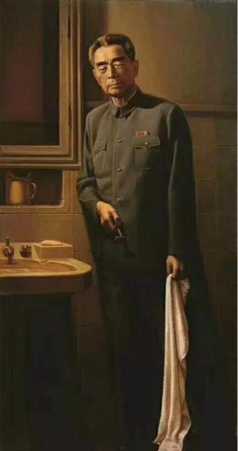 画面中那憔悴消瘦的面容、稍稍倾斜的身姿、右手的刮胡刀、左手垂落的毛巾,与人们熟悉的那位英俊潇洒、神采奕奕的总理判若两人。然而,这些细节非但没有损害周总理的形象,反而将一位鞠躬尽瘁、死而后已的好总理刻画得更加真实、高大,更加震撼人心。