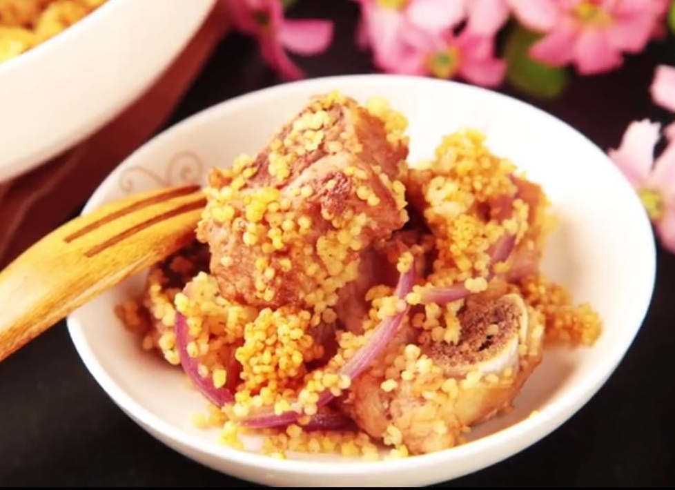 原料:水发小米200克,排骨段300克,洋葱丝35克,姜丝10克、大蒜10克