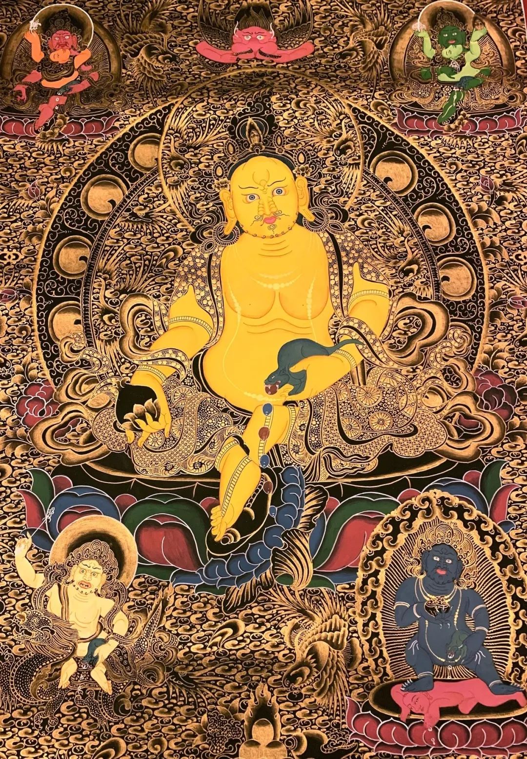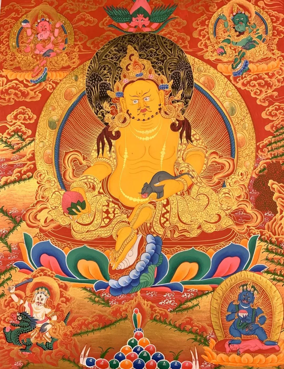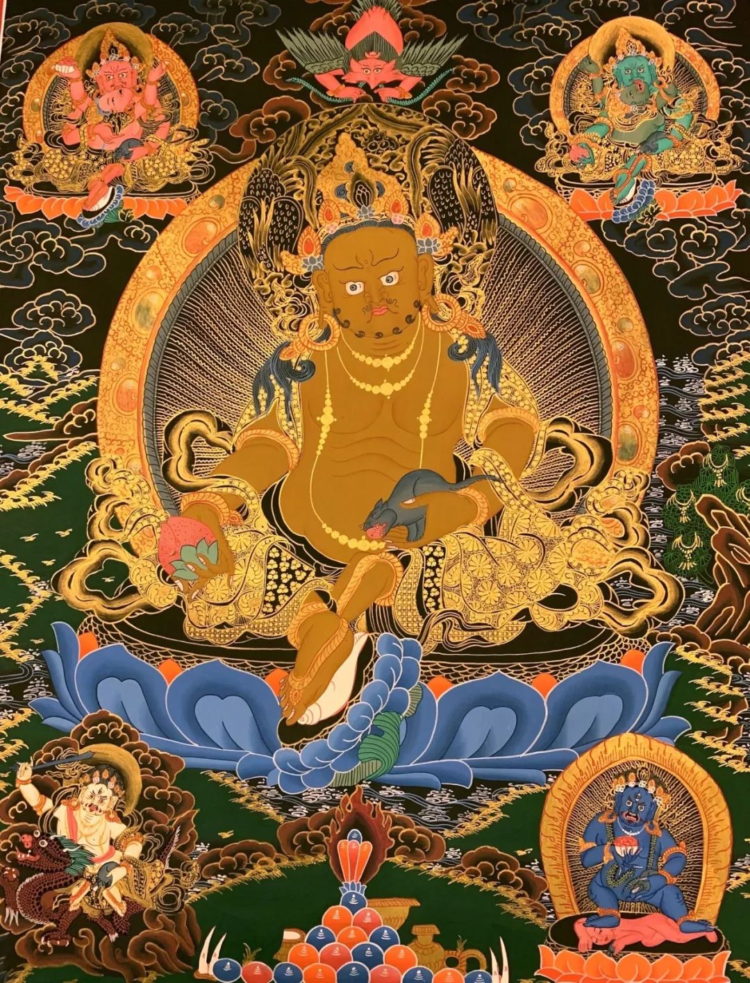 因此,在家挂上一幅“黄财神唐卡”,修持黄财神法或持诵其密咒可获得黄财神庇佑,能增长福德、寿命、智能、物质及精神上之受用,财源茂盛,免除贫穷。