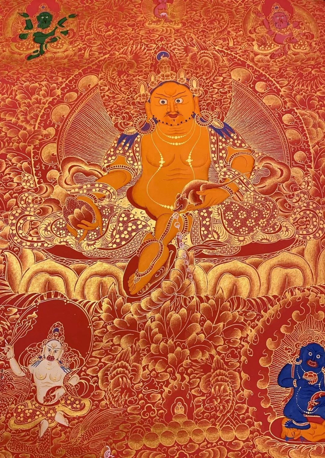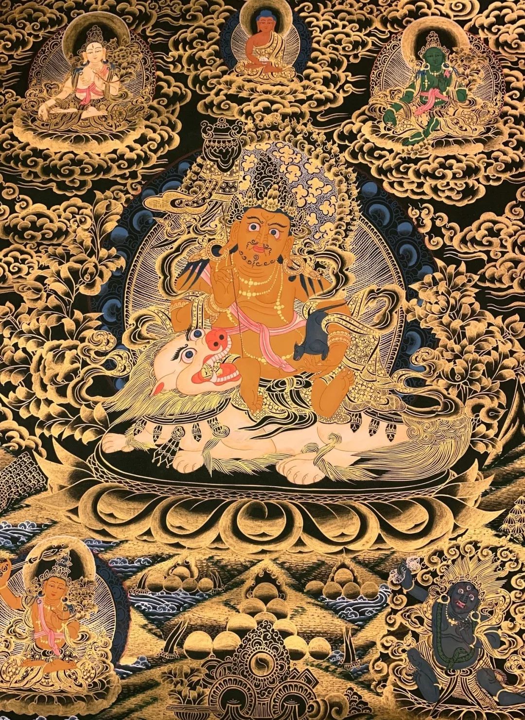 黄财神右手持摩尼宝,象征宝光普照十方,增添众生的福报;左手抱一只大猫鼬(吐宝鼠),鼬的嘴里含着珠宝,象征财宝。右脚踏一只白色海螺,象征着他能入海取宝。有这样的大护法为缘主庇护,能财源广进也是指日可待的事情。