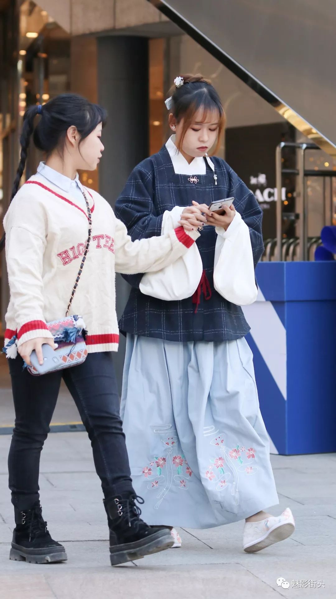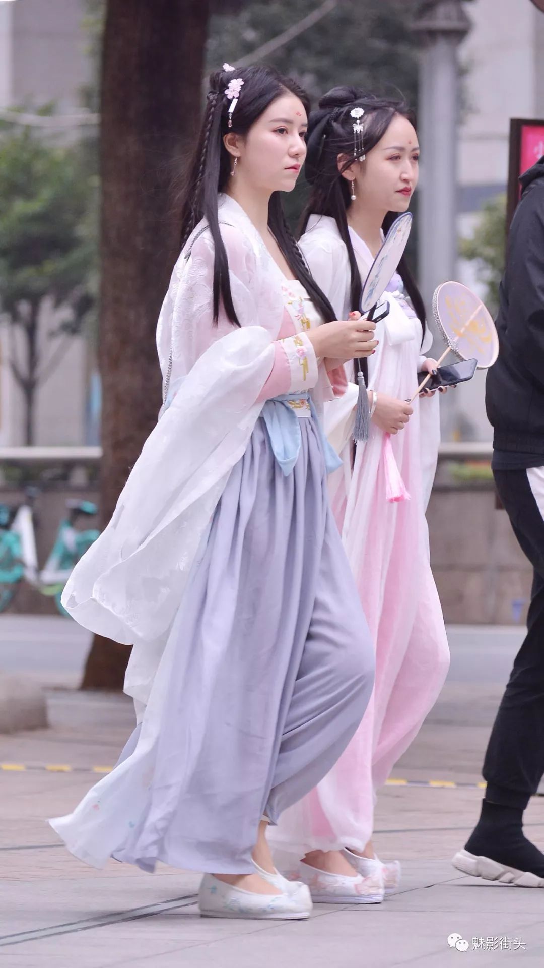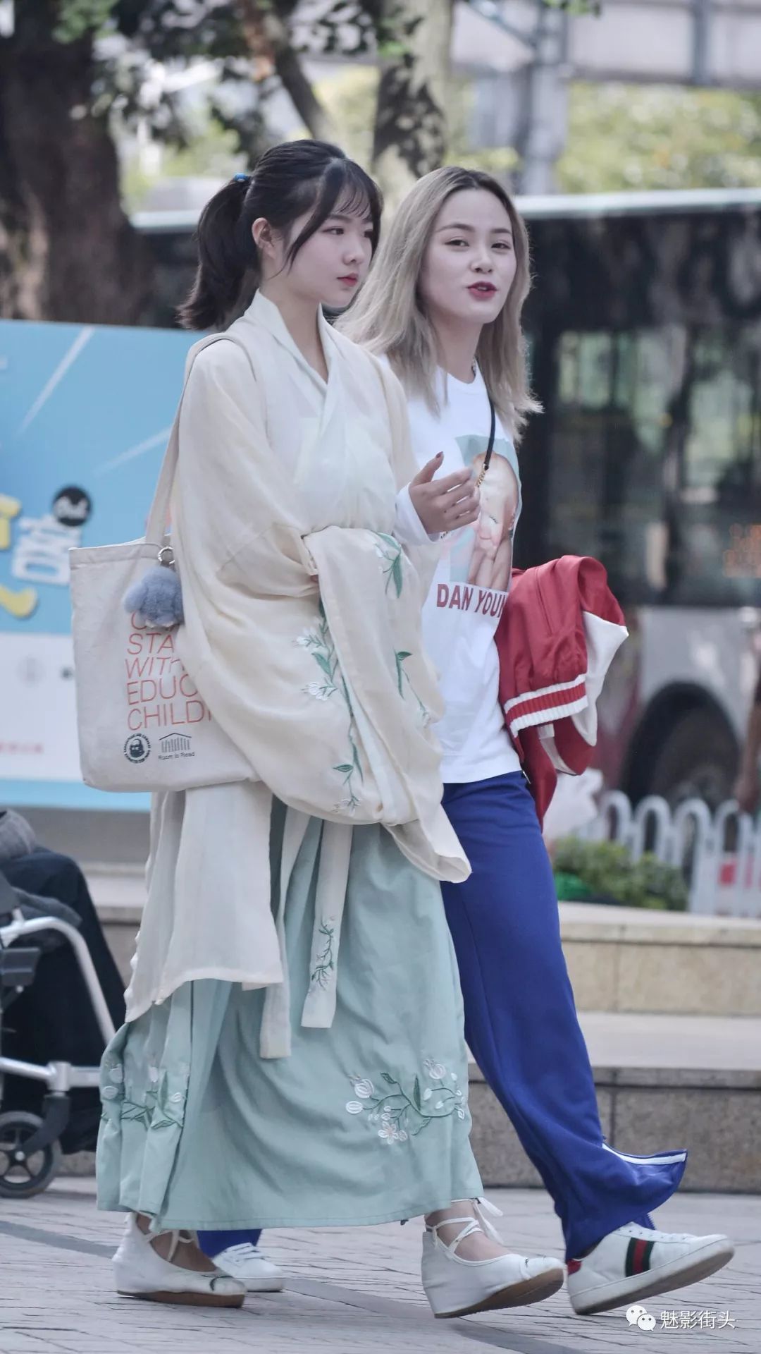 照片中的两位小姐姐皮肤白嫩,气质不错,左边的小姐姐身穿汉服双手环抱胸前,两人迈着优雅的步伐漫步街头,可以说是古典美女与现代美女的相互辉映,穿汉服的小姐姐脚上穿了的布鞋居然还是带内增高的,真是加入了高科技的古典气息。