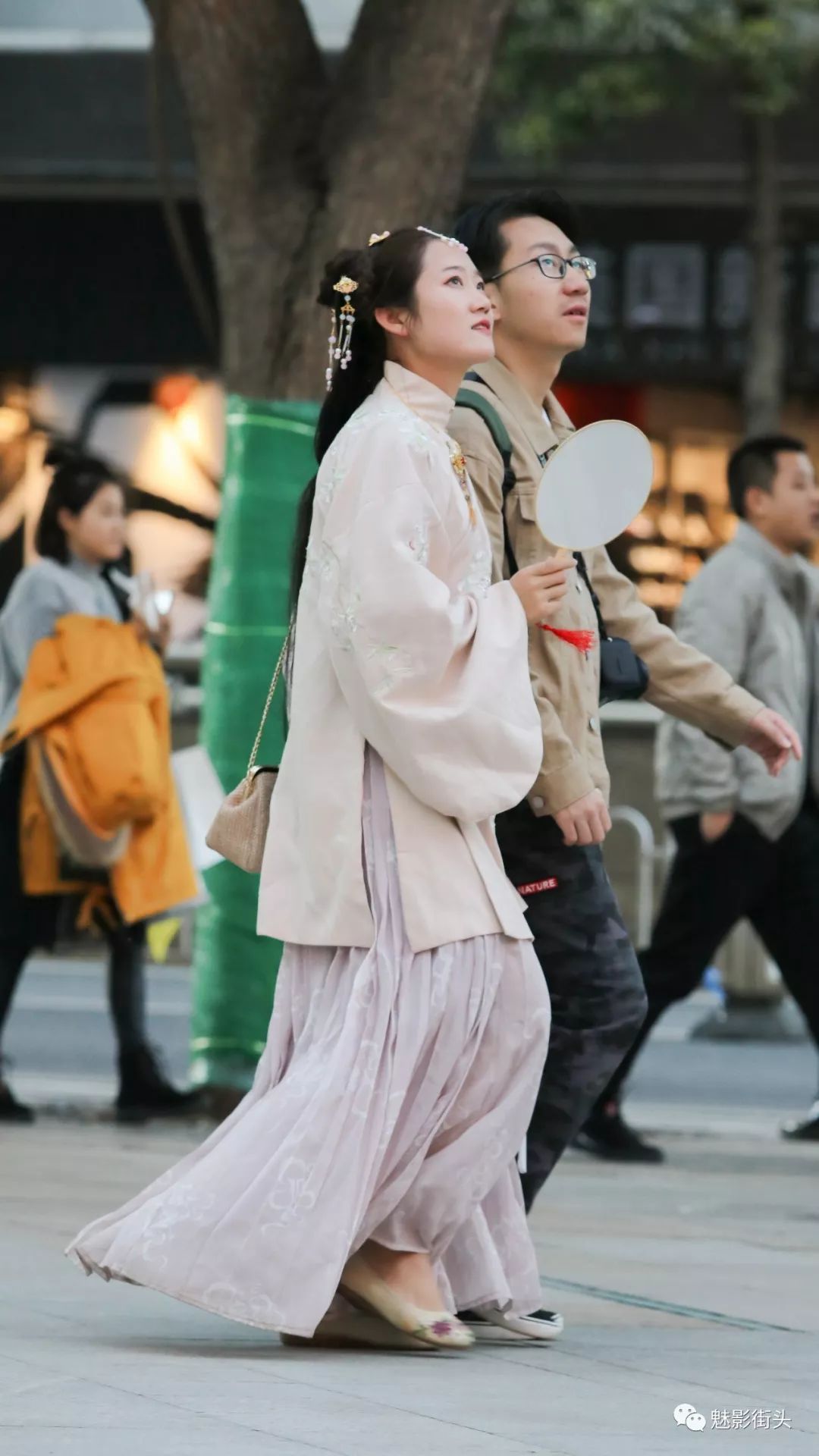 这位美女手拿蒲扇和男友漫步在街头,给人一种古代人和现代人的结合。美女发髻高挽、戴着珠钗,步履蹒跚,很有大家闺秀的气质。
