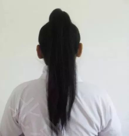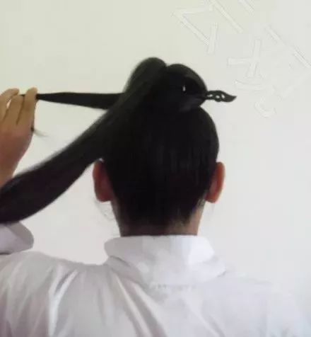 二、右手手心朝后,五指撑开,左手将头发放在右手。