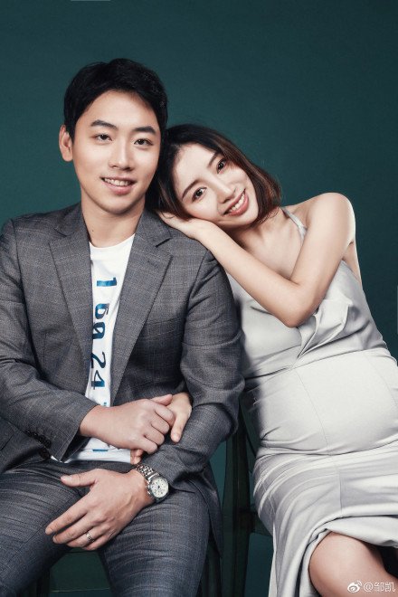 邹凯一身西装,妻子穿着晚礼服,两人笑容灿烂。在一组“床上照片”中,邹凯还把耳朵贴在妻子的大肚上,似乎在倾听宝宝的心跳。