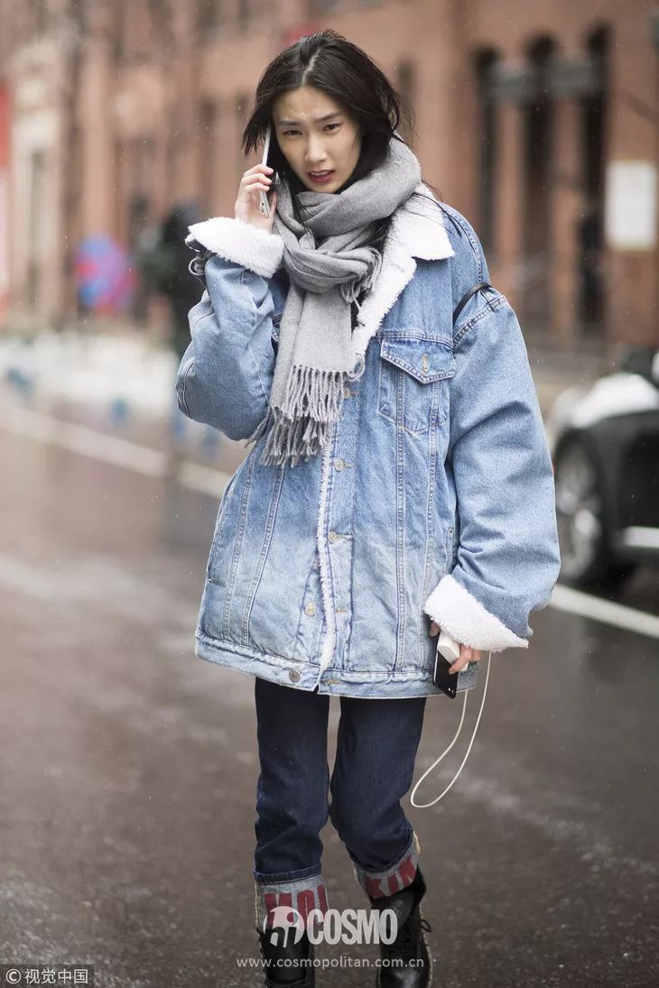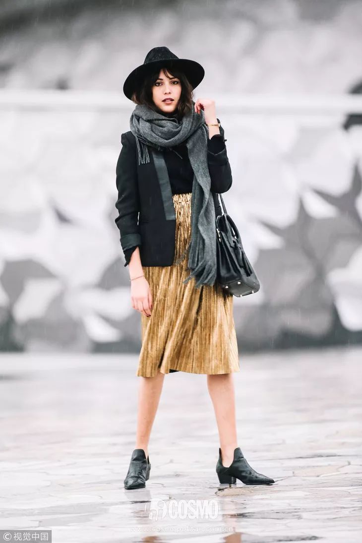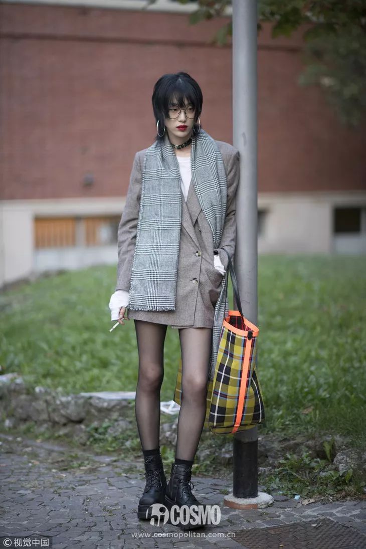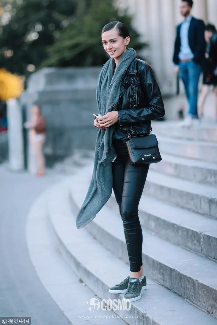 这里的短外套是指西装、皮衣这一类。灰色围巾自带提升气质的效果,皮衣虽然有点不羁感,但和灰色围巾的组合就显得大气多了。