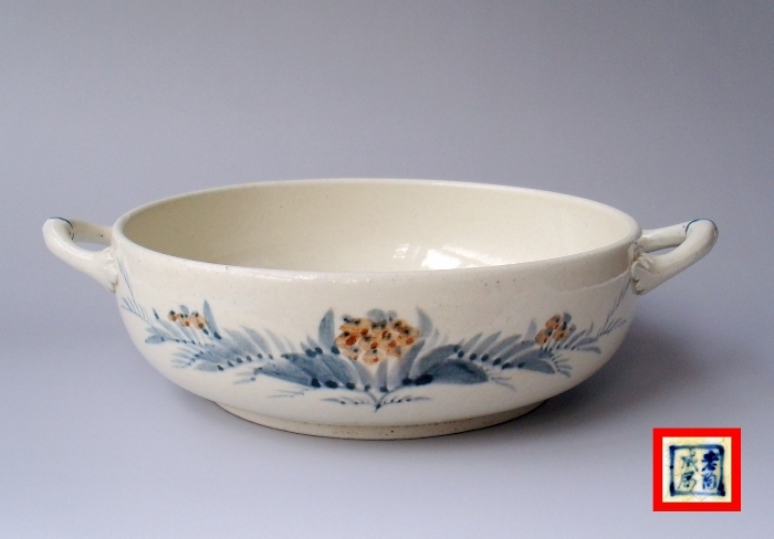双面彩青花釉里红橄榄枝纹双耳盘,口径约19厘米,高约6厘米,竹节状双耳,造型优美。瓷盘外侧装饰有两组手绘的青花釉里红橄榄枝纹饰,底部有手书的青花英文字母“V”的标识。瓷盘造型和纹饰具有明显的西洋特色,这是克鲁•魏克到启新磁厂工作初期,使用从德国引进的陶瓷生产设备,彩绘原料,使用唐山本地陶土制作的陶瓷艺术珍品。由此可见,克鲁•魏克拥有高超的陶瓷制作技艺和深厚的陶瓷艺术功底。