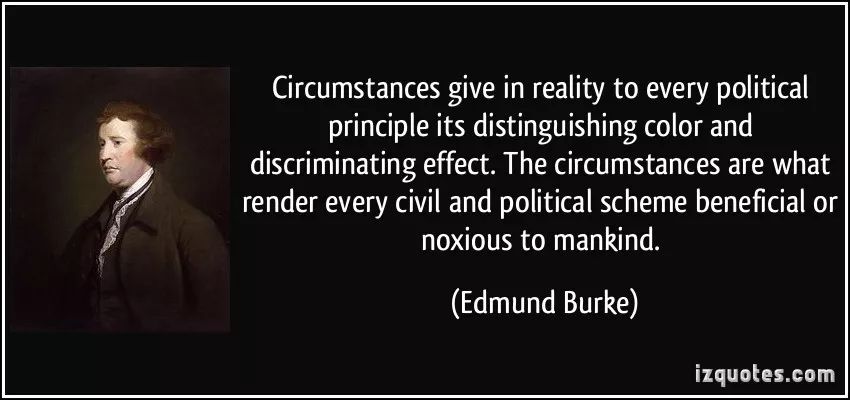 “实际上,形势(Circumstances)赋予了每一种政治原则以突出的色彩和独特的效应。正是形势决定了每一项民事或政治计划对人类有益还是有害。”——埃德蒙·柏克