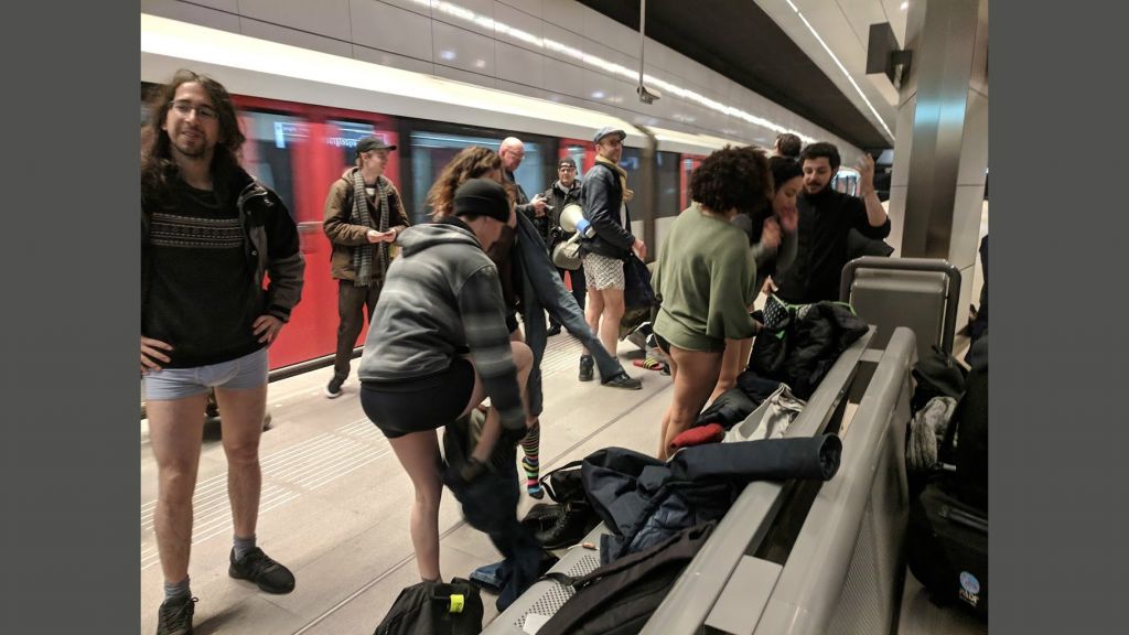 在阿姆斯特丹这是第一次举办这样的活动,有30多人参加,在下午15时,他们在 Vijzelgrach地铁车站脱裤轻装上阵。