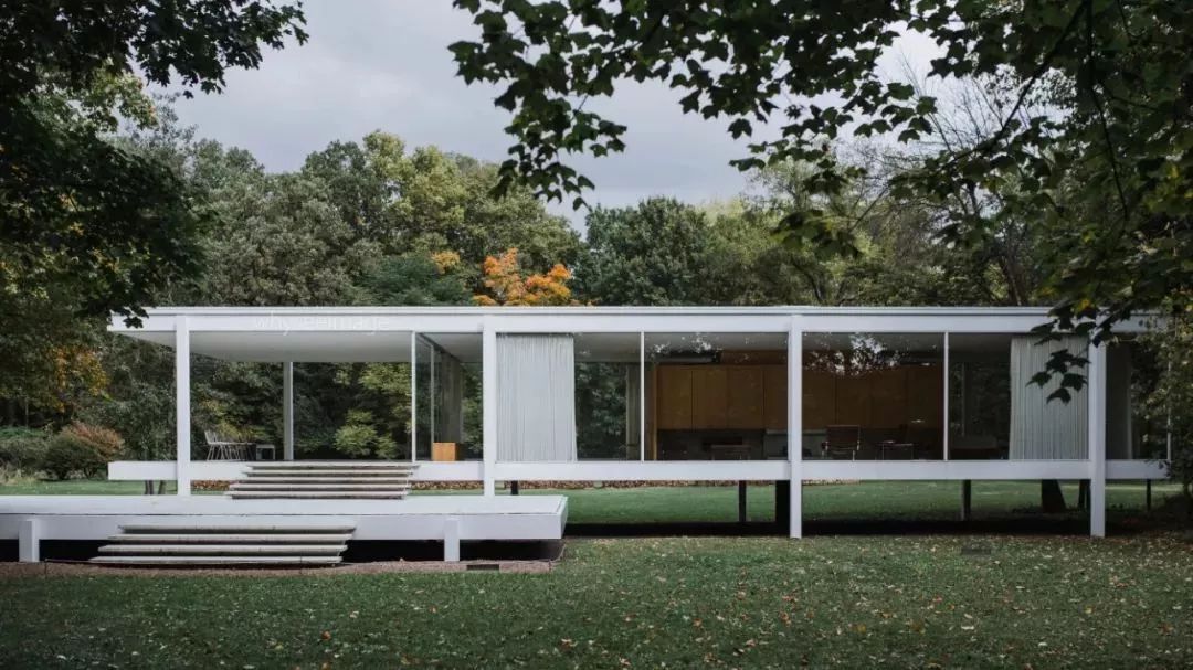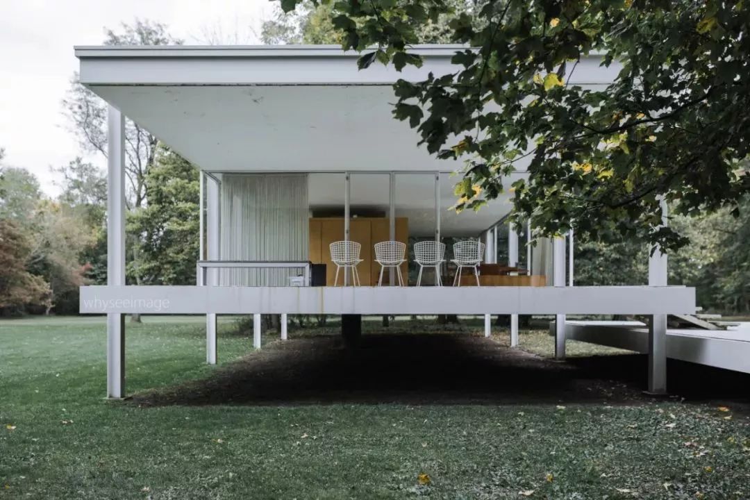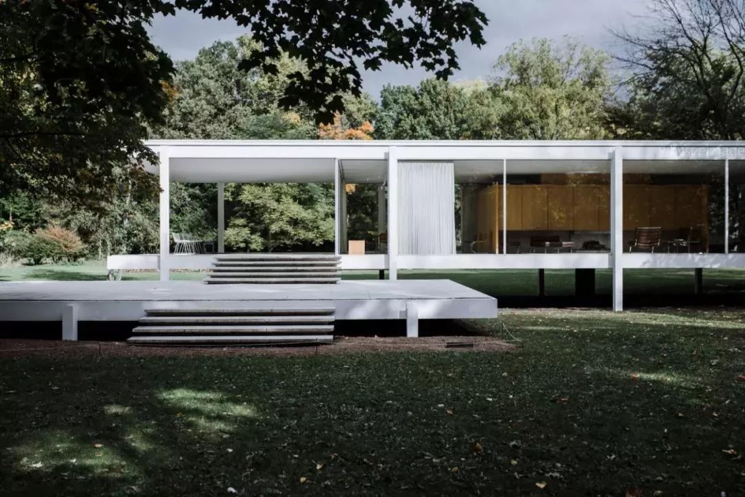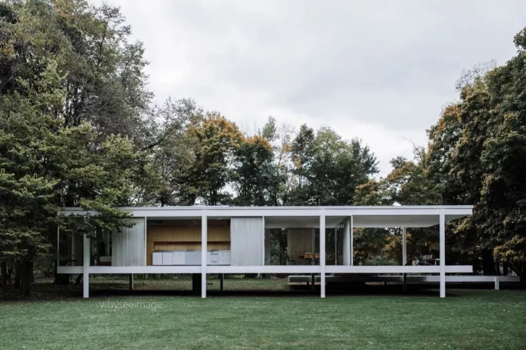 建筑完美地体现了密斯的设计美学:极简、秩序、纯粹。密斯曾说“生活的本质在于地板和屋顶,其他就是比例和自然,房子是否讨人喜欢并不重要。”