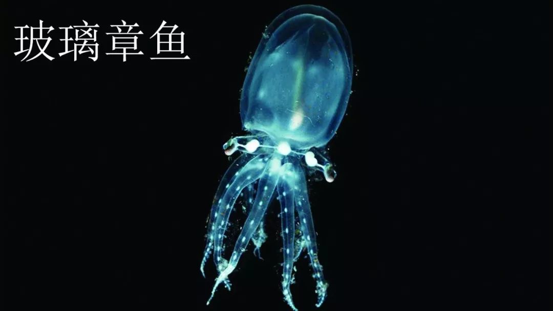 在海洋里,不但有玻璃章鱼,还有玻璃鱿鱼,玻璃鱿鱼种类较多,大约有60多种,生活在海平面下200~1000米的海域中。玻璃鱿鱼与玻璃章鱼类似,能使光线穿过它的身体,并且它的眼睛也不是透明的。与玻璃章鱼不同的是,玻璃鱿鱼都长着又圆又大的眼睛,那么它们是怎样将大眼睛藏起来的呢?原来玻璃鱿鱼的眼睛下面长着一种特殊的发光器官,这种器官能够发出与周围环境光照强度相同的光芒,借此隐形,与生活在海平面附近的某些动物类似。在下方游动的捕食者看不到玻璃鱿鱼,但玻璃鱿鱼的大眼睛使它们可以“眼观六路”,从其他角度捕捉到捕食者的位置,方便逃跑。