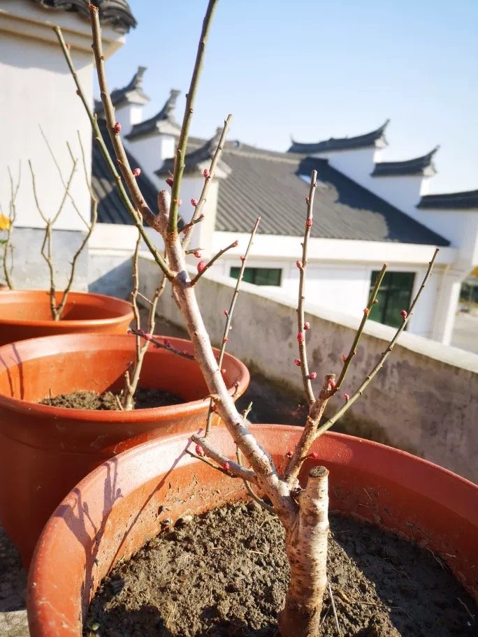 盆栽养殖的梅花常用直径20-25厘米的盆。盆栽花谢后换盆,换盆选择在晴天将梅桩脱出,除去宿土,剪除长根、枯根、烂根,将开过花的1年生枝条剪短留基部2-3个芽点。