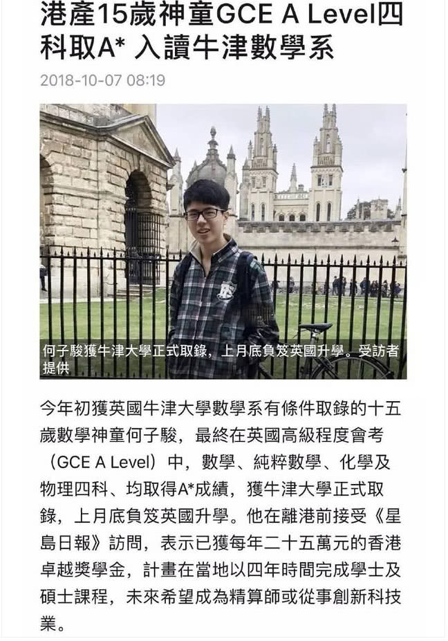 媒体报道的这位来自香港的15岁数学神童何子骏,被牛津大学正式录取。重点是他和刘昊然长得实在是太像了!光看照片就让人怀疑媒体这边是不是错用了刘昊然本人的照片呢!虽然刘昊然本人也在微博上转发回应:再来一个就自动消除了。仍挡不住网友们的惊奇之心,引起热烈讨论。