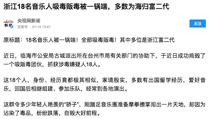 央视新闻网在14号13点41分发表了一篇报道,名字就叫“18名音乐人吸毒贩毒被一锅端”。