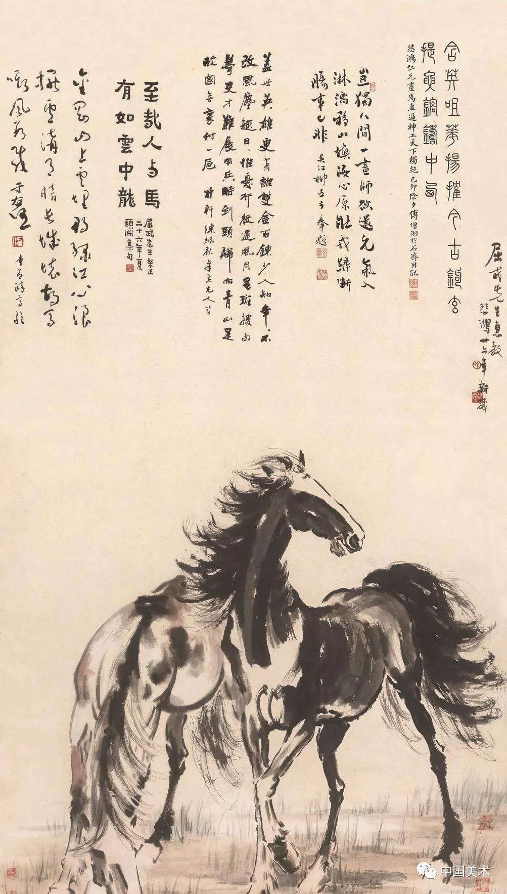 一九四二年从印度回国后,悲鸿先生在艺术界集有基础成就的画家,在四川磐溪建立中国美术家学院研究绘画。他那时画的马,则更加注意了结构,而又采用泼墨或工兼写意的表现手法,着重刻画马的神态和气质。