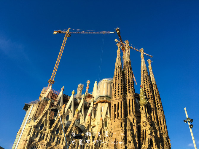 外面游客非常多,从远处可以看到教堂上工作的脚手架。高迪认为这座教堂是在跟上帝对话,因此建得非常高。