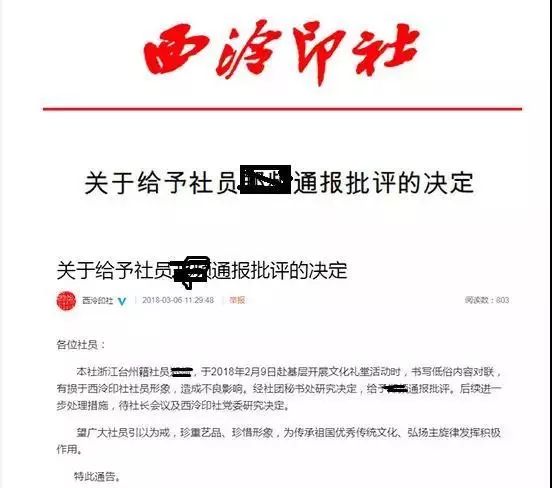 事件后,3月8日,西泠印社发出通报批评。
