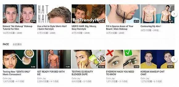 在油管上有许多彩妆视频,其中有很大一部分专为男生打造的,比如男士如何修容和打高光,如何打理发型,如何用画笔填充络腮胡,如何用修容棒打造八块腹肌等等。