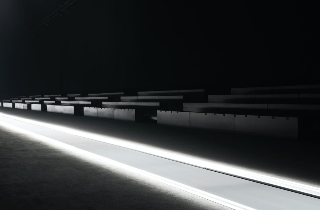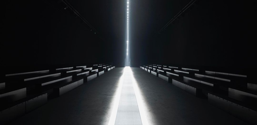 场内灯光昏暗,座椅简朴,唯有一道窄门透出一道光亮,就像耶和华降世般闪耀,穿出来的光,映射在中间的窄长的滚动电梯上——这是走秀时模特们出来的地方。