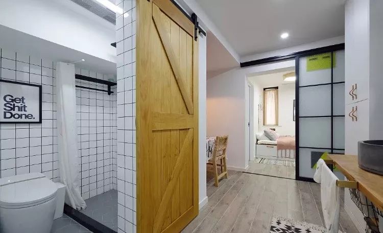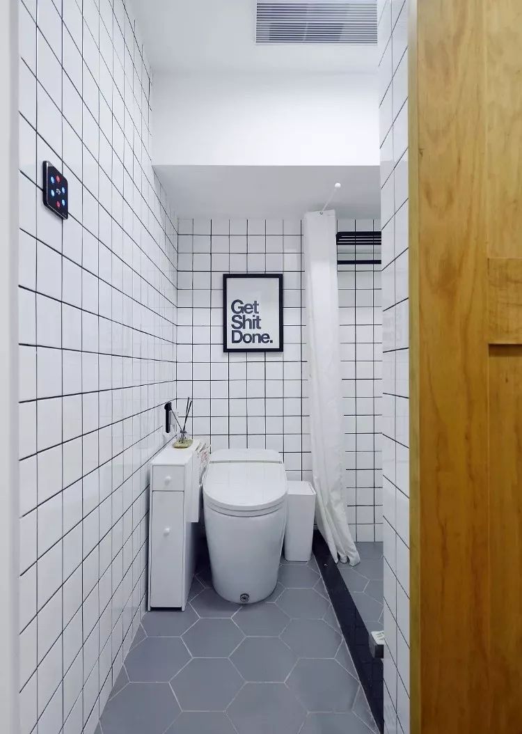 卫生间里的干湿分离就用浴帘和挡水条来组成,没那么拥挤。