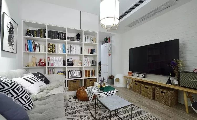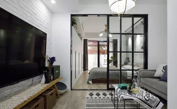 走道之后就是客厅啦。又是一个被左右“夹住”的客厅,地面以上的地方都是白色,同时,主卧与客厅好院落的隔断墙都换成了通透的玻璃隔断。用文化砖作为电视背景墙,搭配沙发边的书架,又糙又真实。