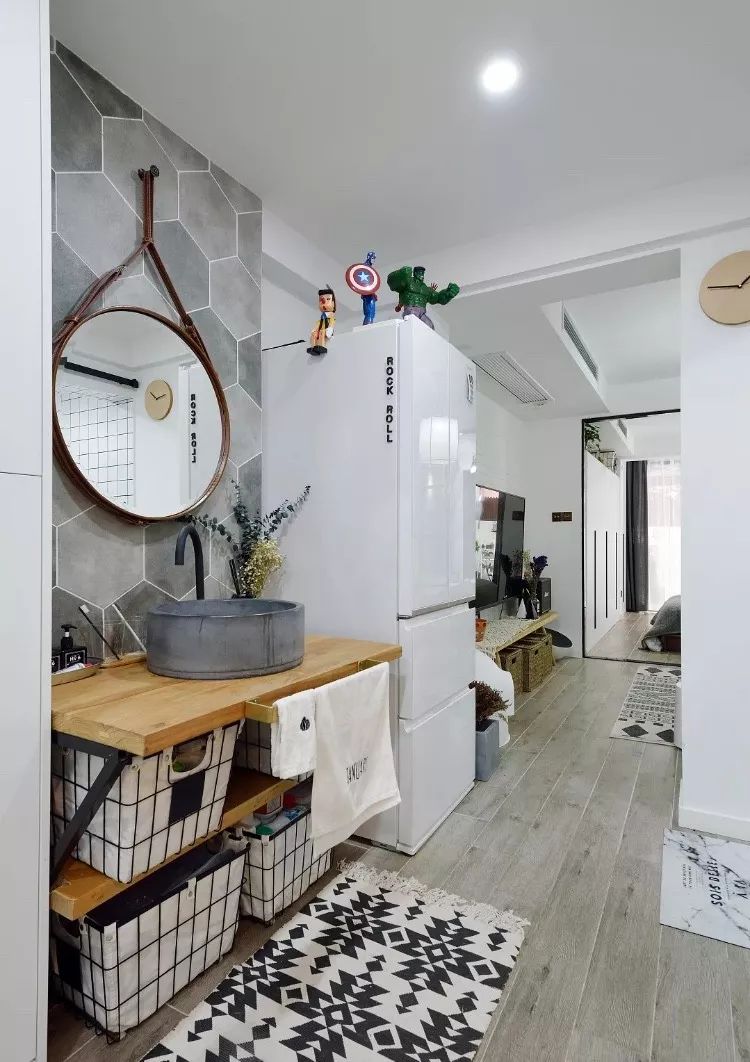 长条形的户型就是要将过道两侧充分利用起来,于是洗手台和冰箱都排排站出来,和组合挂画或者贯穿过道的条形柜体比起来,这样浓厚的生活气息似乎也挺不错。