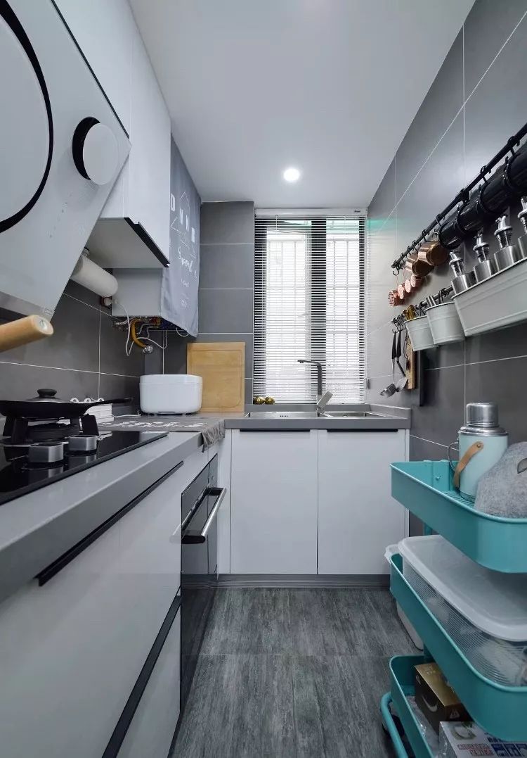 厨房就在次卧的边上。L型的厨房是最适合小户型长条形厨房的设计了,靠着次卧的这面墙做了很多方便取放的收纳设计,麻雀虽小,五脏俱全。