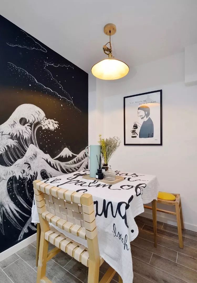 餐厅布置在入户正对的一角,空间比较迷你,相应地选择了腿较细长的小方桌。对于这样一个小空间来说,丰富的细节更能呈现它的“分量”,绝不是随便划个空间用餐而已。所以选用黑白色描绘的海浪图占据了整墙,一点也不浮夸,反而不显空洞。