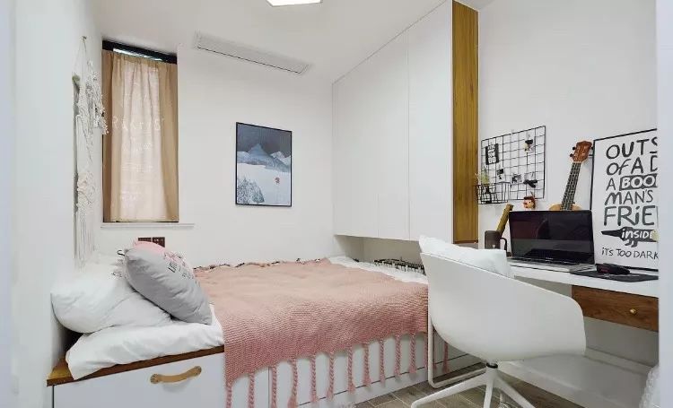 次卧改成带书桌和柜体的榻榻米房,增加了办公的功能。除了侧面的抽屉收纳外,床头也加入了收纳设计,做成底部留空的吊柜,脚就刚好放进去啦。