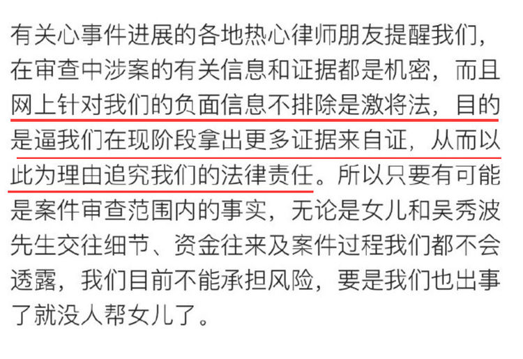 这两天网上出现大量陈昱霖的负面消息,陈昱霖父母暗指吴秀波团队雇水军营销号在网上带节凑,不排除对方使用激将法,目的是逼他们在现阶段拿出更多证据自证,从而以此为由追究法律责任。